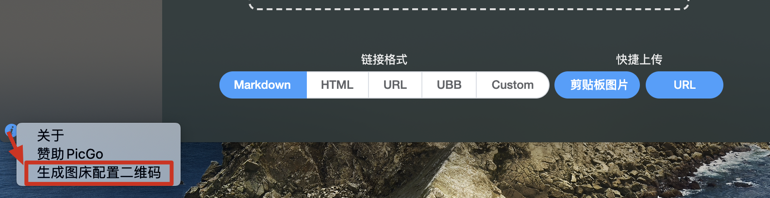 可以通过点击主窗口左下角信息栏按钮,找到「生成图床配置二维码」菜单
