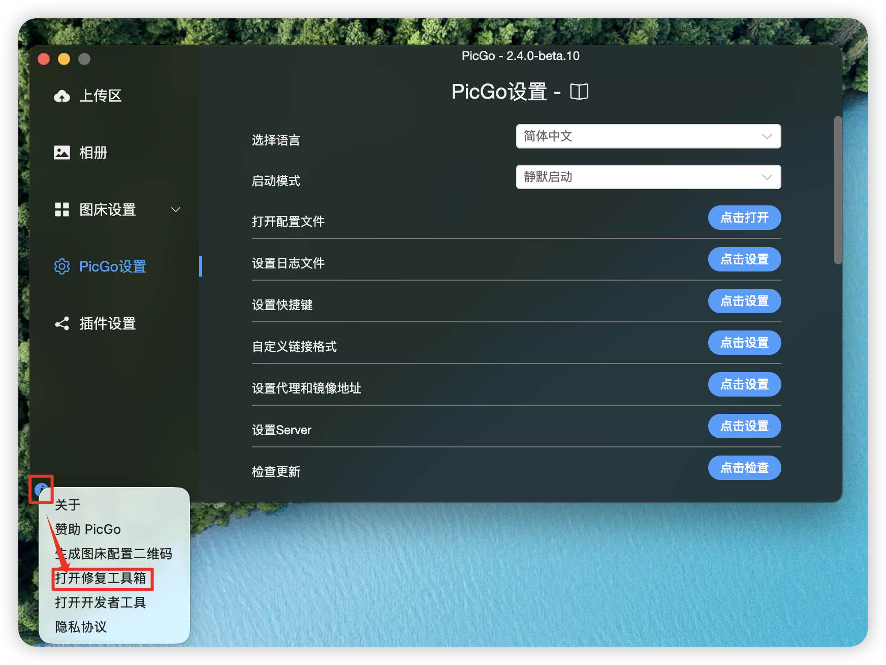 从 2.4.0 版本开始,在主界面的 i 图标按钮中,有一个「PicGo 修复工具箱」功能,当你遇到 PicGo 使用异常的时候,可以尝试用修复工具箱自主排查和修复问题。