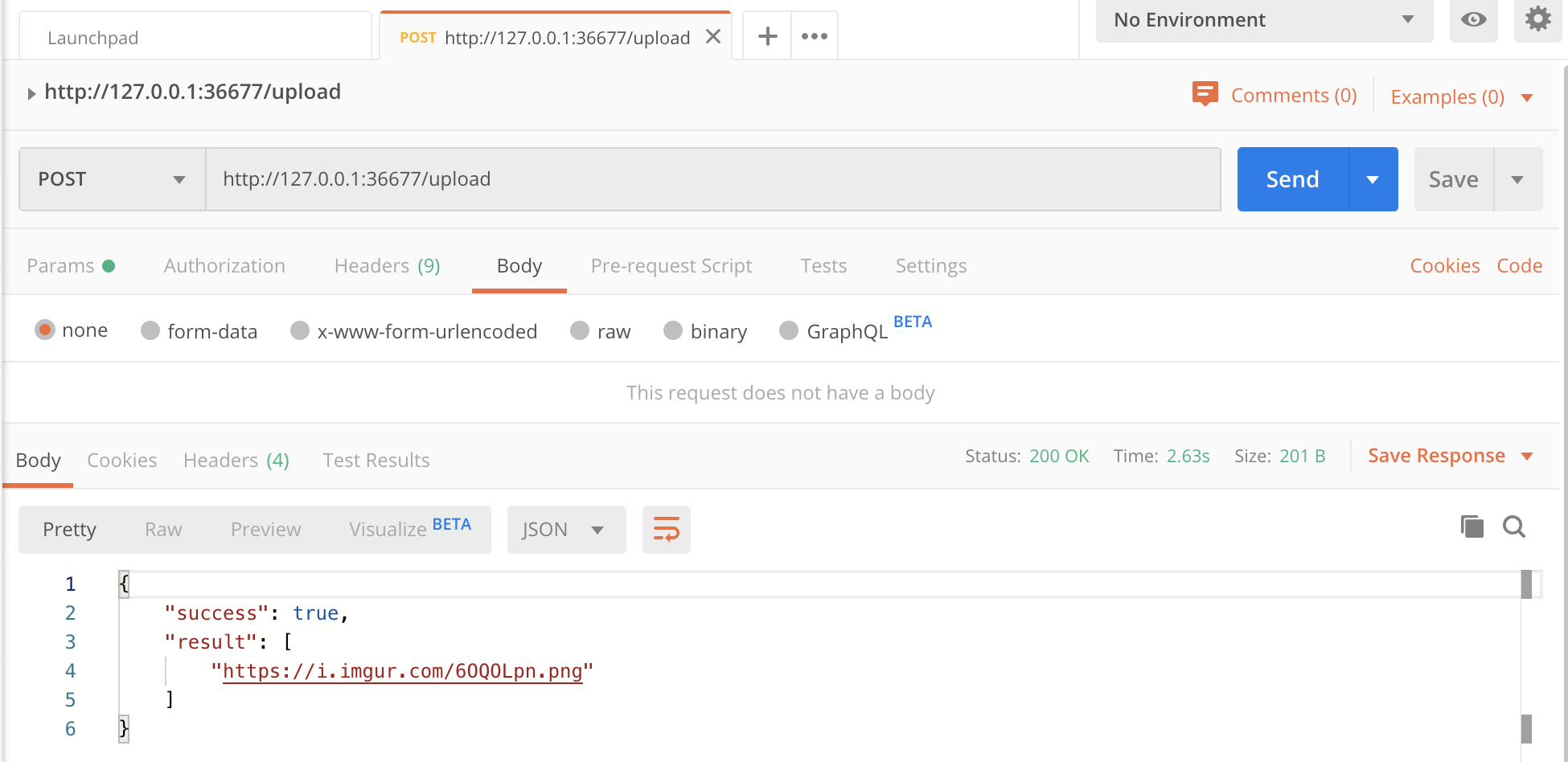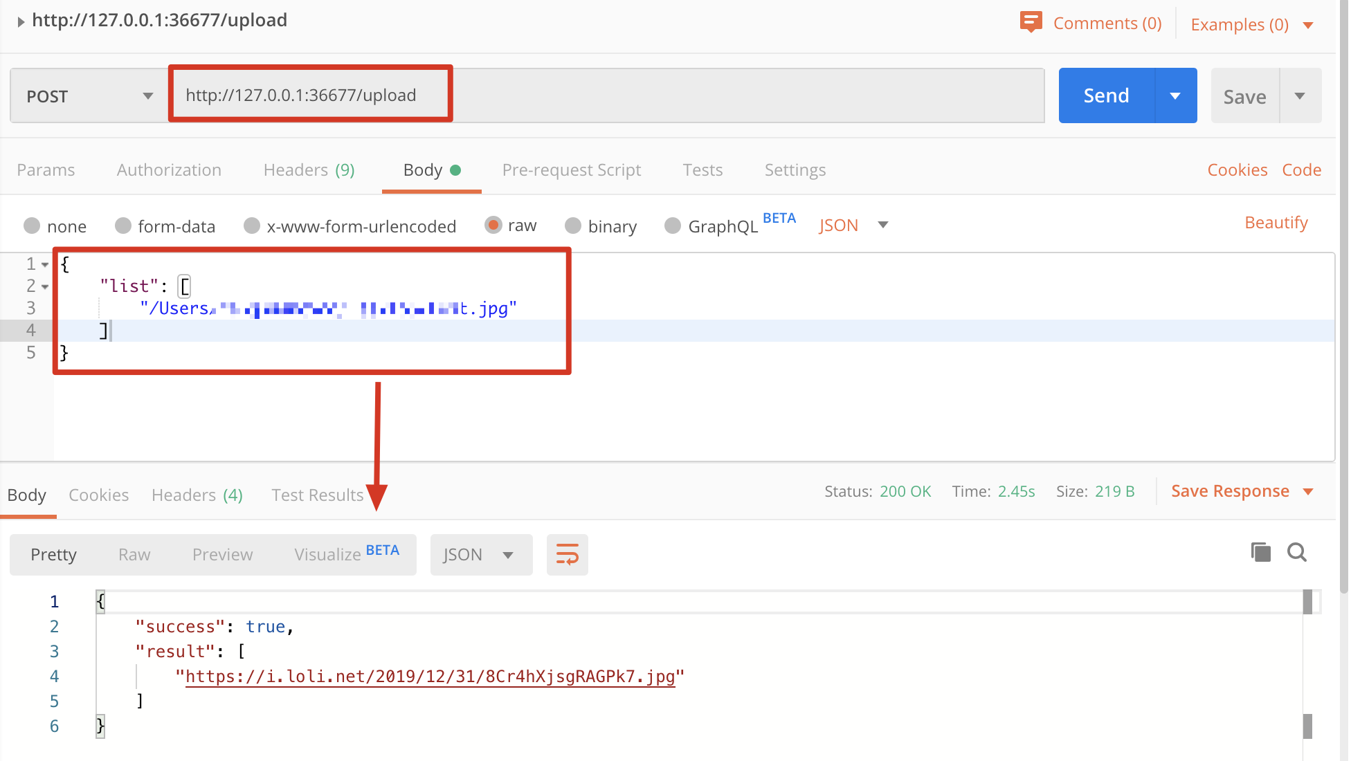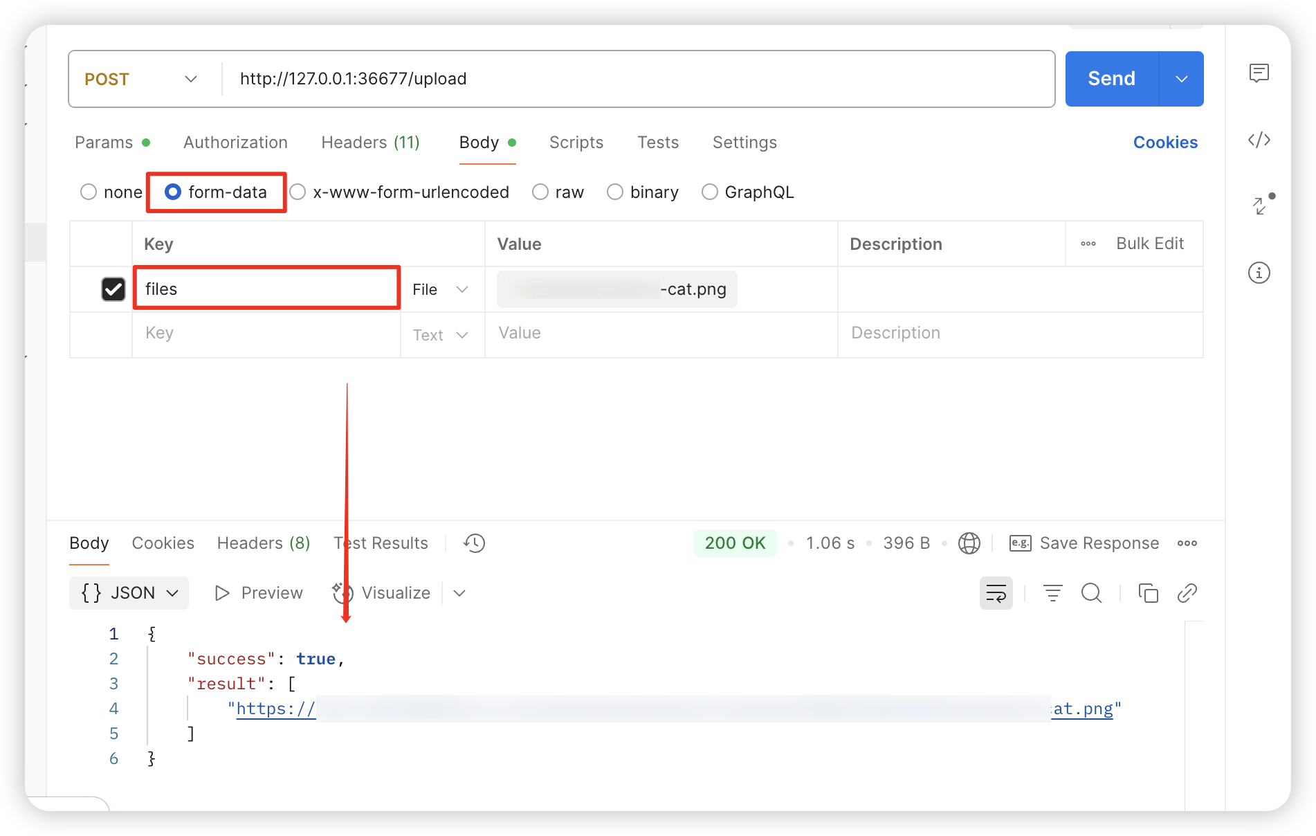 http://127.0.0.1:36677/upload(此处以默认配置为例) - request body: form-data,key为